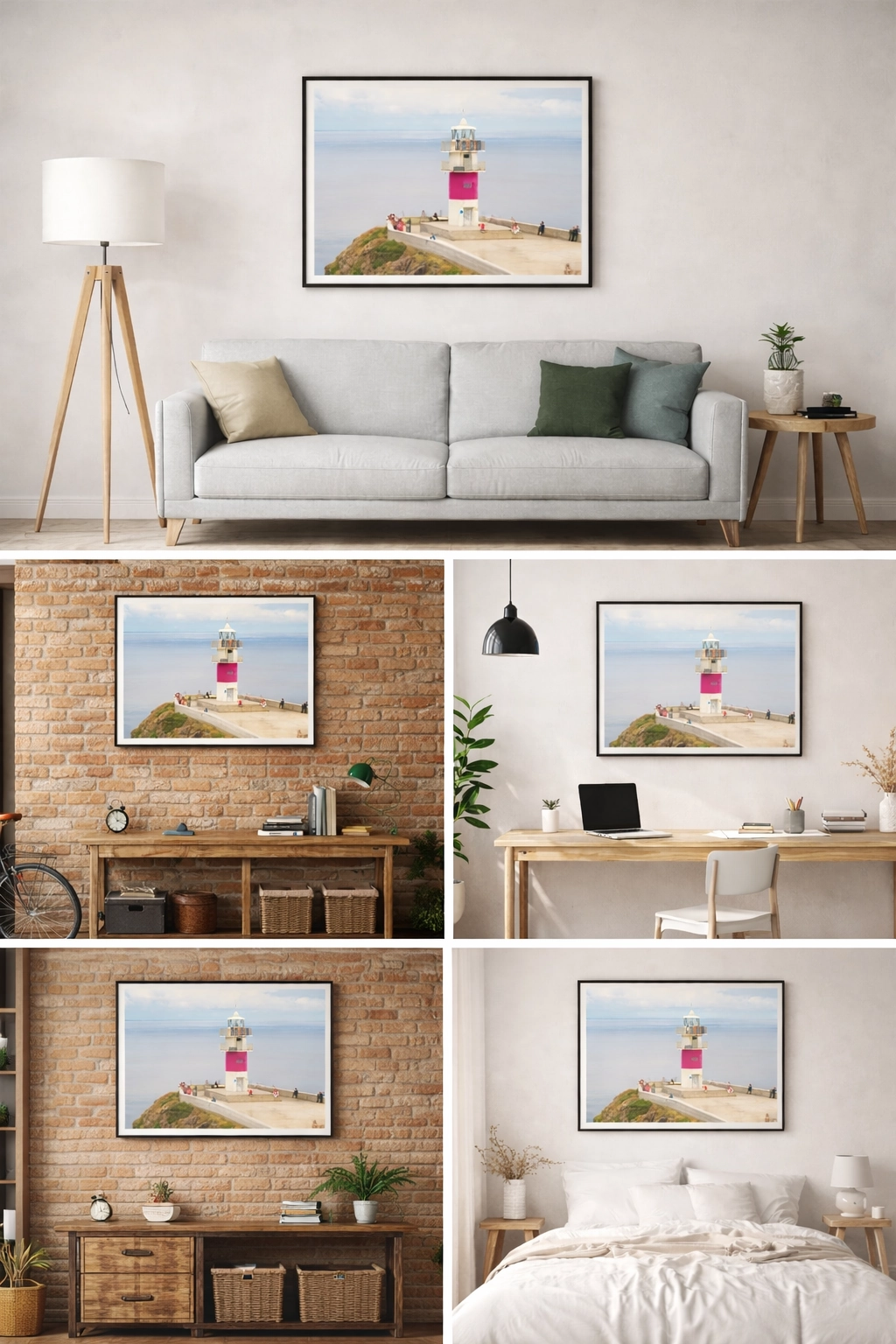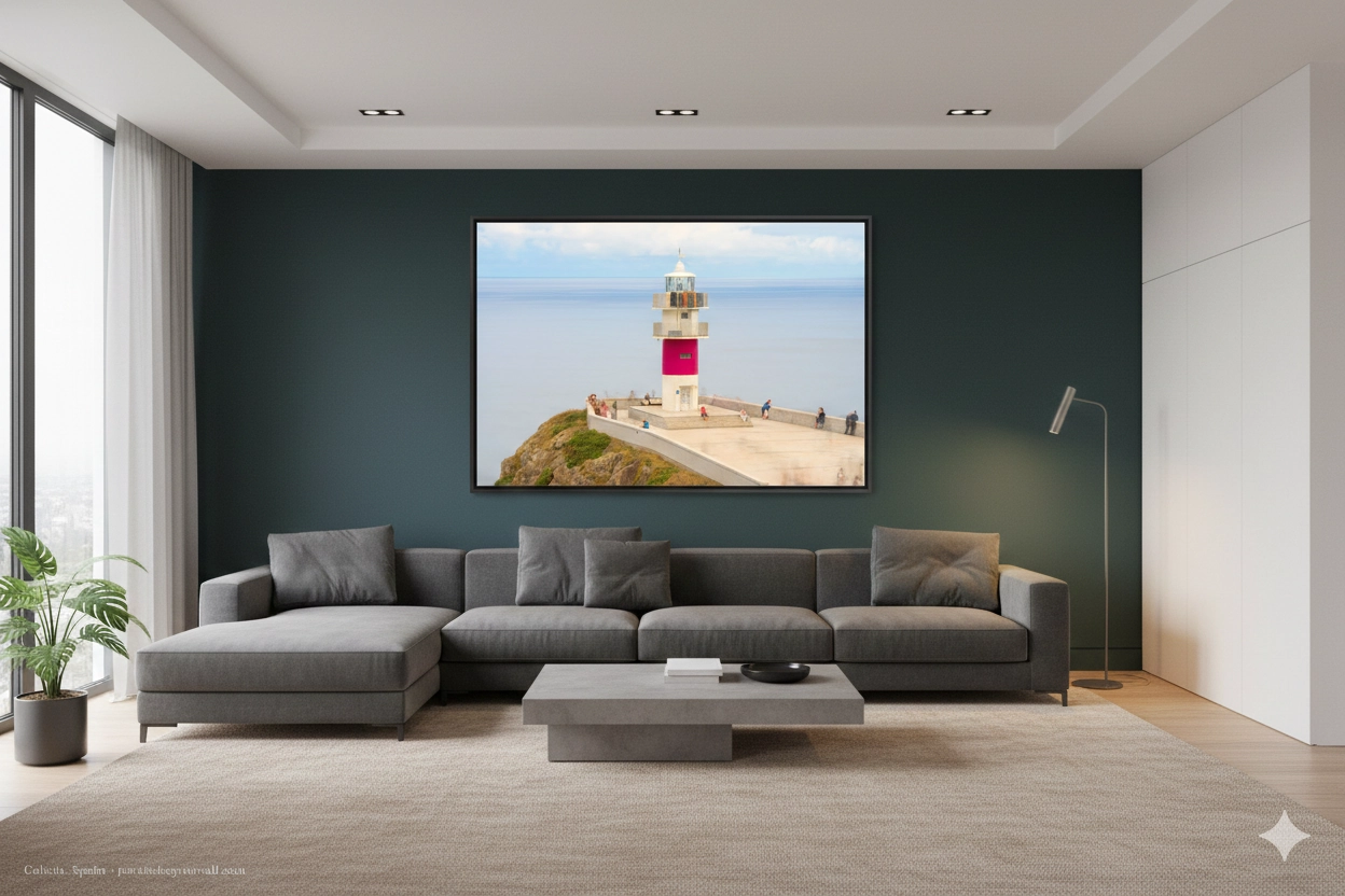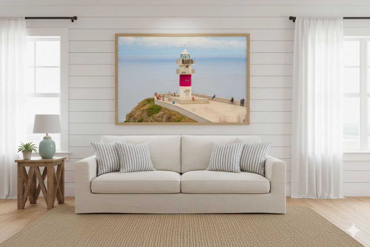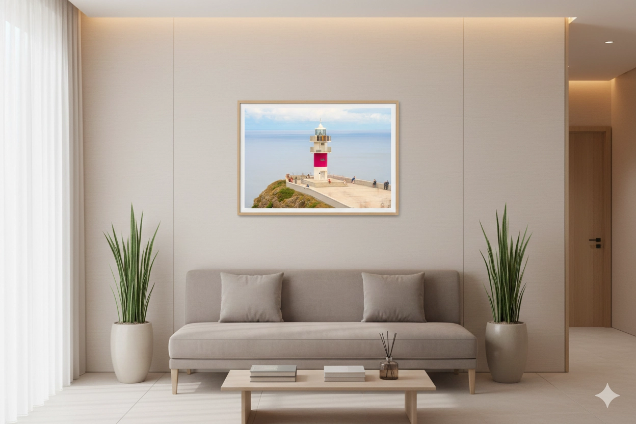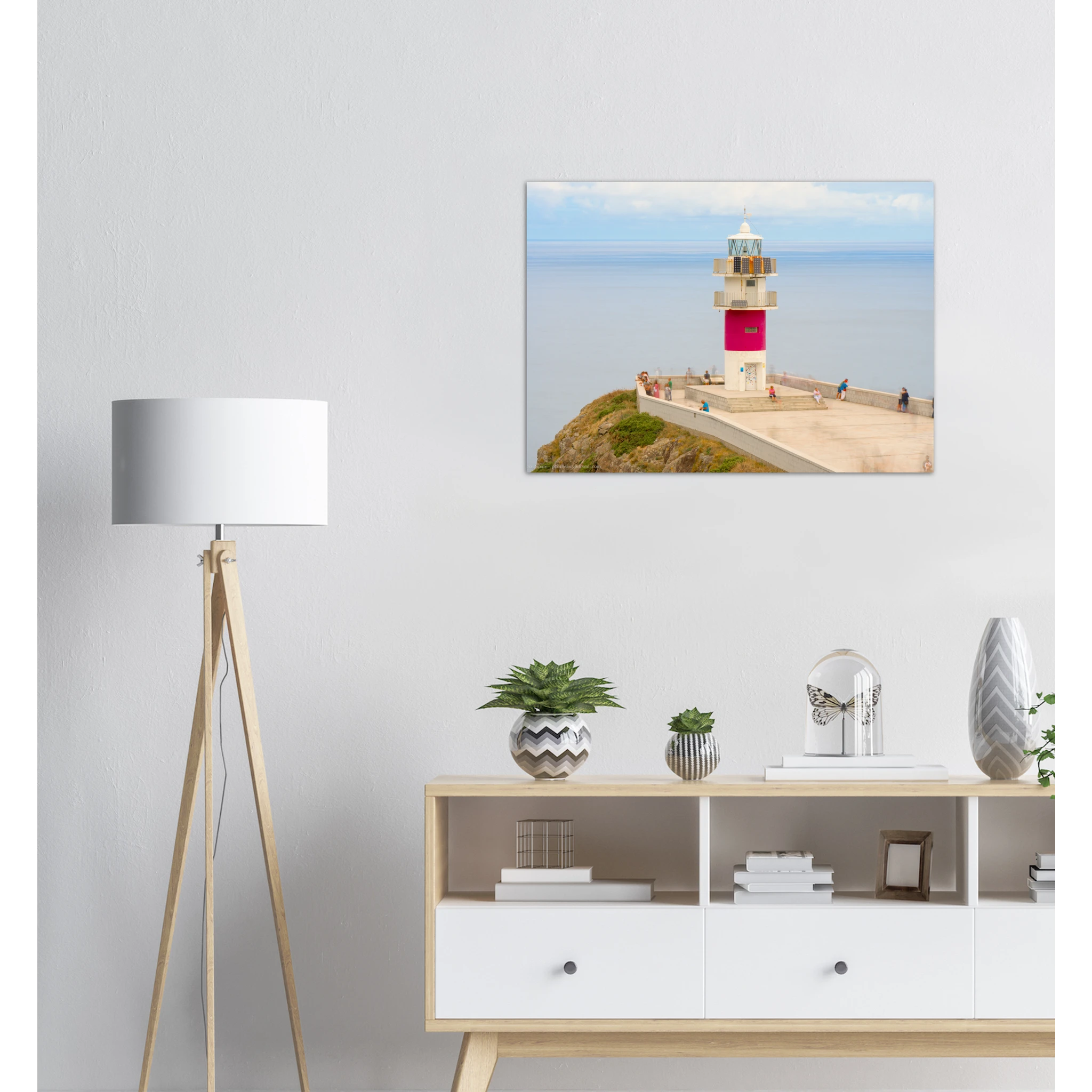 This high-quality print highlights the vibrant contrast between the lighthouse’s magenta-red band and the ethereal, misty horizon. It is a perfect choice for those who love maritime history, dramatic landscapes, and the unique light of Northern Spain.