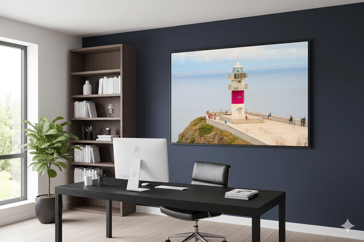 Esta impresión de alta calidad resalta el vibrante contraste entre la banda roja del faro y el horizonte brumoso y etéreo. Es la elección perfecta para amantes de la historia marítima, los paisajes dramáticos y la luz única del norte de España.