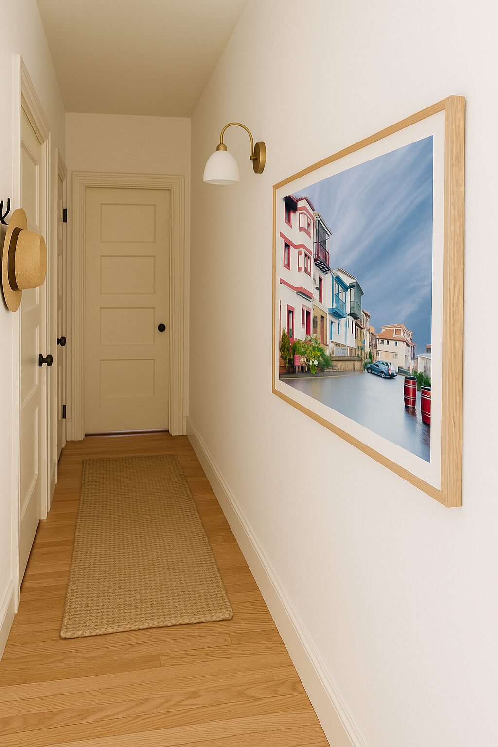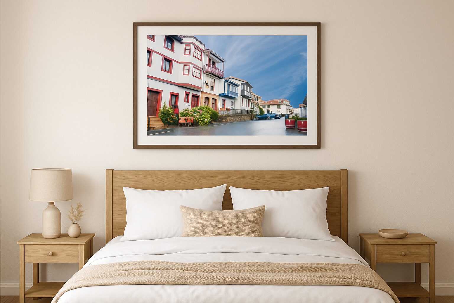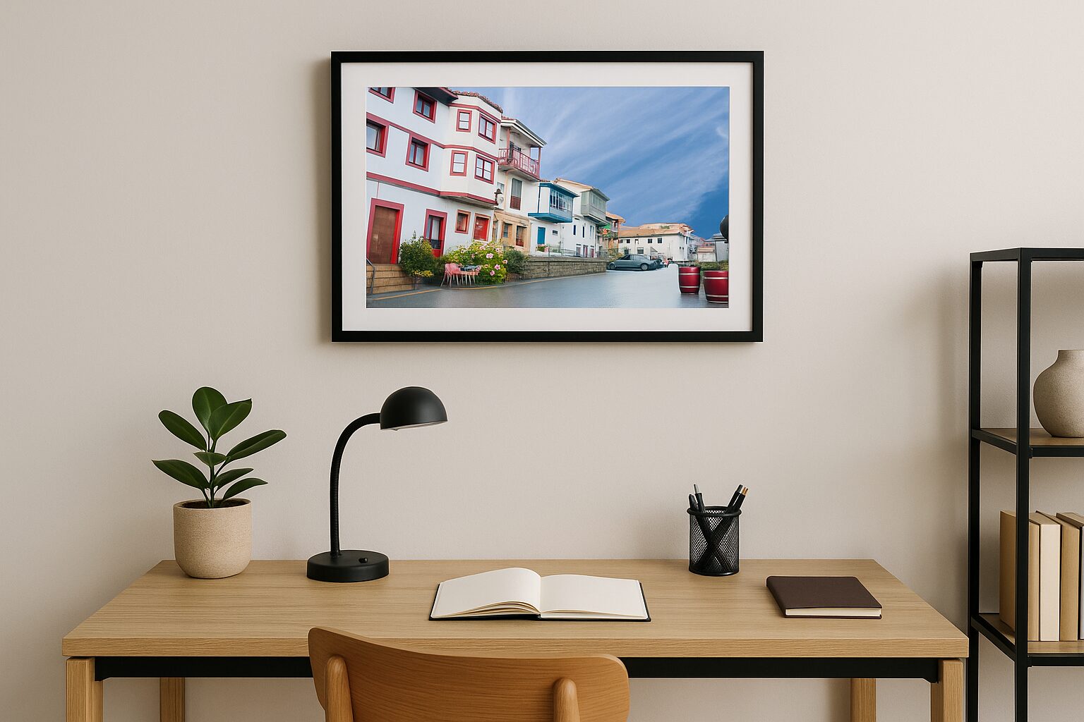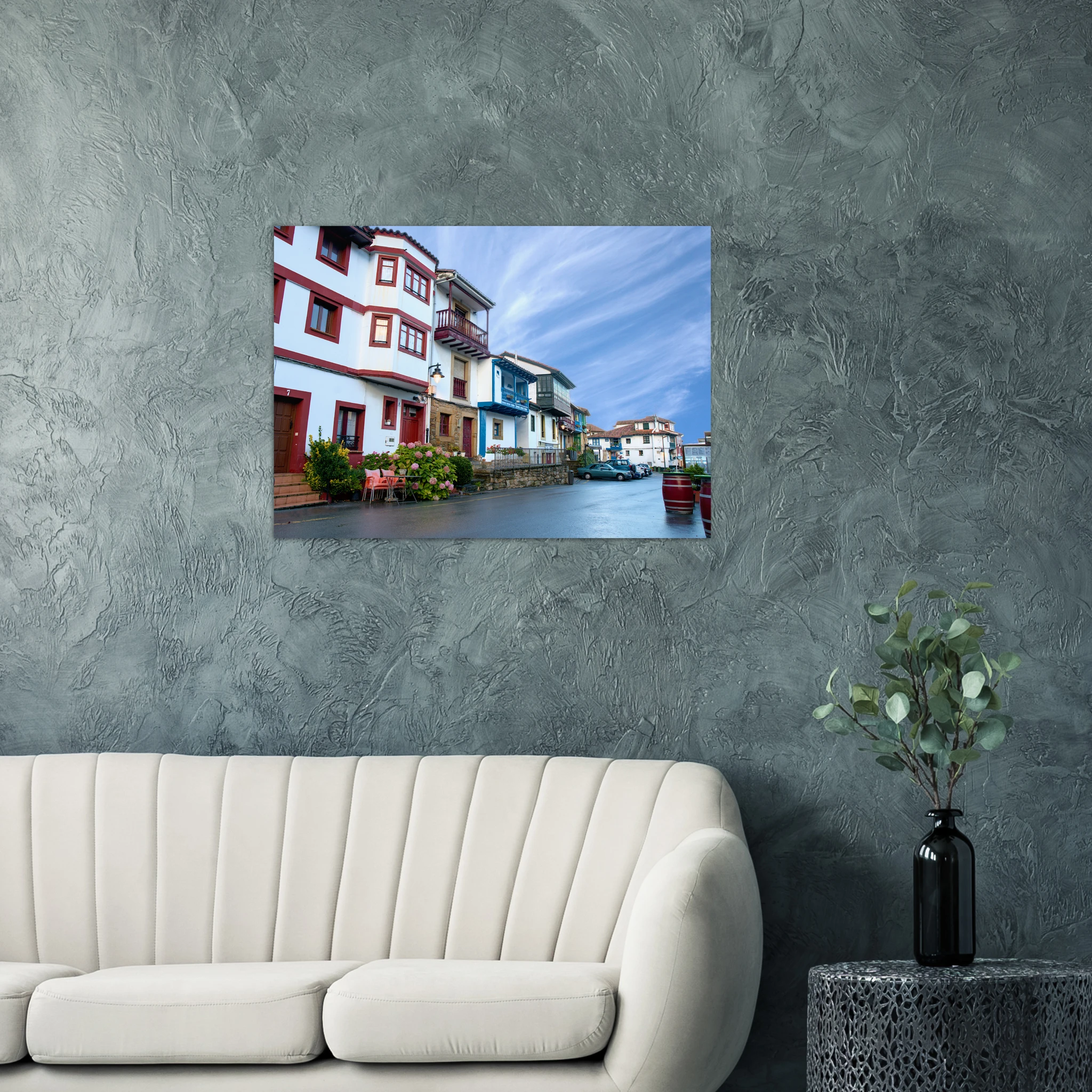 peaceful small-town atmosphere. Perfect for travel inspiration and cultural imagery. / Vista encantadora de una calle con casas tradicionales españolas pintadas en colores vivos, con fachadas rojas, azules y blancas, balcones de madera, hortensias en flor y un ambiente tranquilo de pueblo costero. Ideal para inspiración de viajes e imágenes culturales.